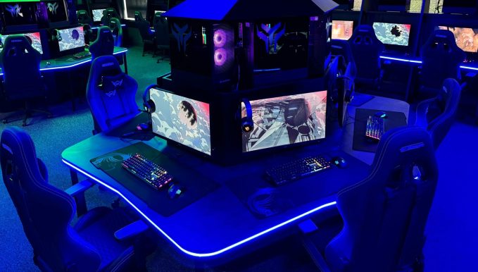 Mae’r gofod wedi’i optimeiddio gyda dau ddyluniad desg ar wahân, ynghyd â goleuadau ymyl LED a silffoedd cloi PC, gyda rhannwr a all rannu’r cyfleuster yn ddau i ganiatáu cystadlaethau gemau, darlithoedd a gweithdai ar wahân.